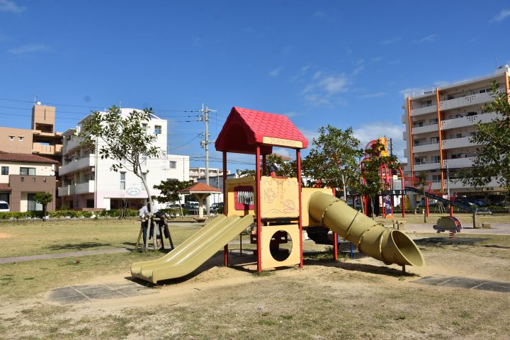 沖縄の家々の屋根や門に置かれることが多いシーサーですが、ここでは公園の主役として存在感を放っています。表情豊かなシーサーが公園を見守る姿は、沖縄らしい風景のひとつ。住宅街の中にありながら、どこか南国らしいのびやかな空気を感じられる場所です。