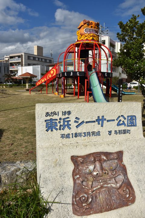 大きなシーサーが見守る、東浜のファミリーたちの憩いの公園。