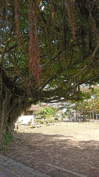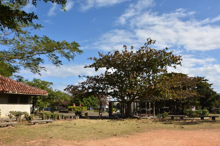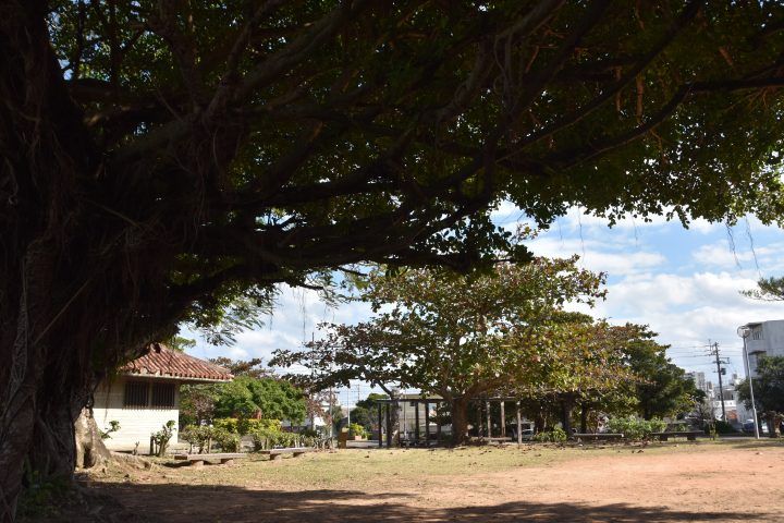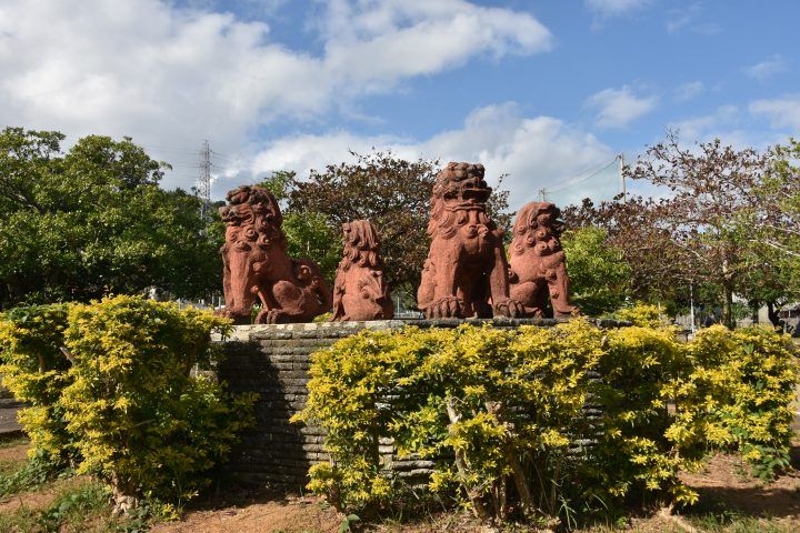 4体の立派な「シーサー」が飾られている、奥行きのある公園。