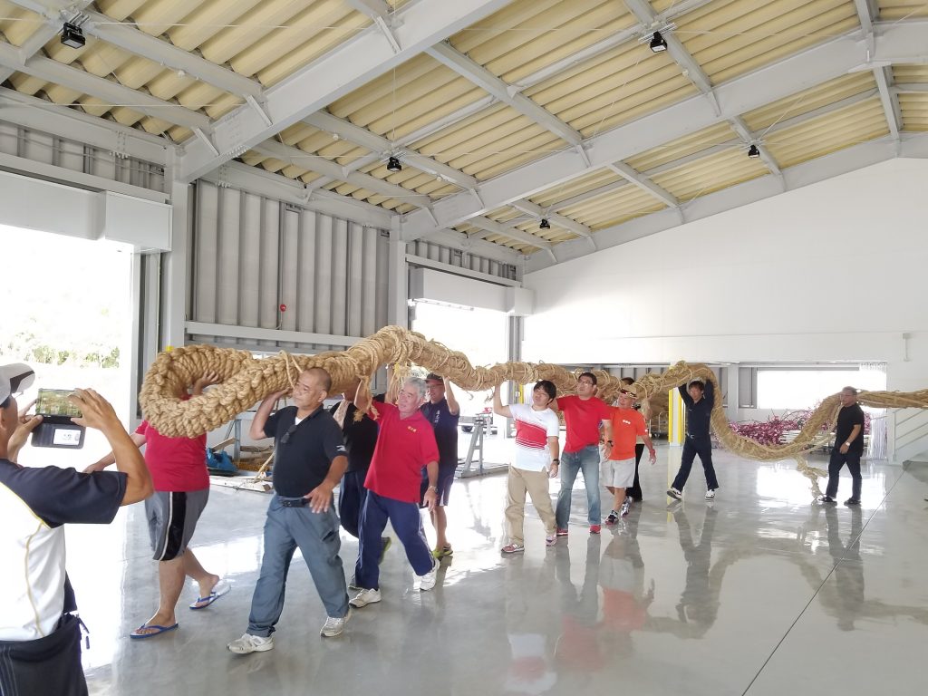 その熱意を受け、与那原の「綱武士(ちなむし)」たちが快く綱つくり作業をお見せし、また小学校にあった「こども綱」を寄贈いたしました。