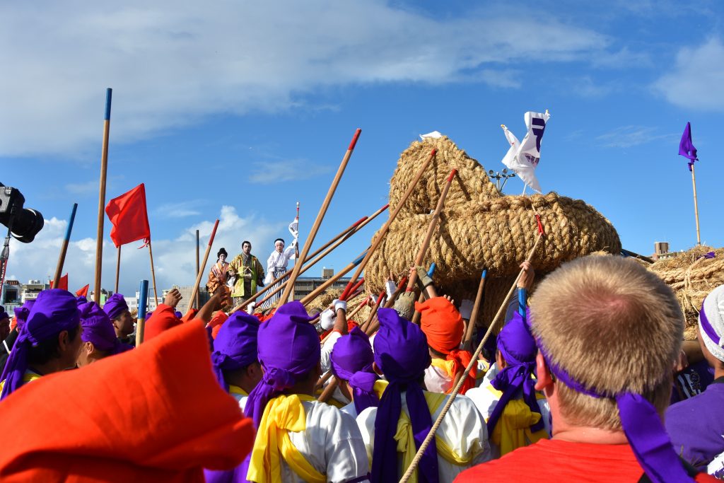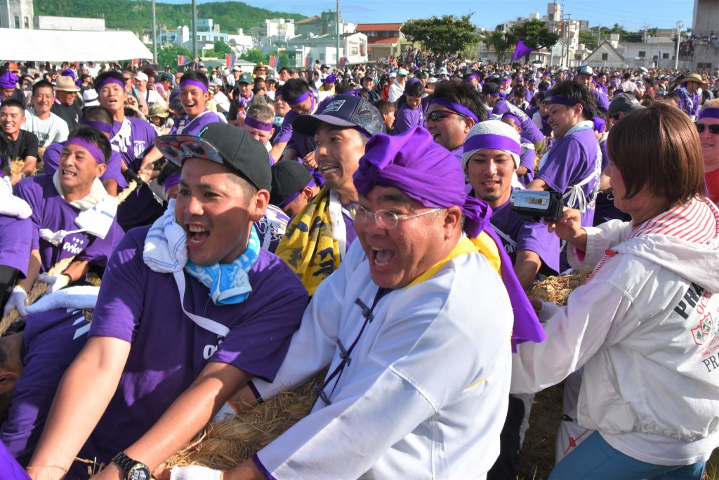 勝ち名乗りをあげて東(あがり)の旗頭が舞い、その後お互いにすり合わせて慰労し合います。与那原大綱曳は「曳きちゅらさ、勝ちちゅらさ、負きちゅらさ」と伝えられていて、「勝っても負けてもわきあいあい」なのです。