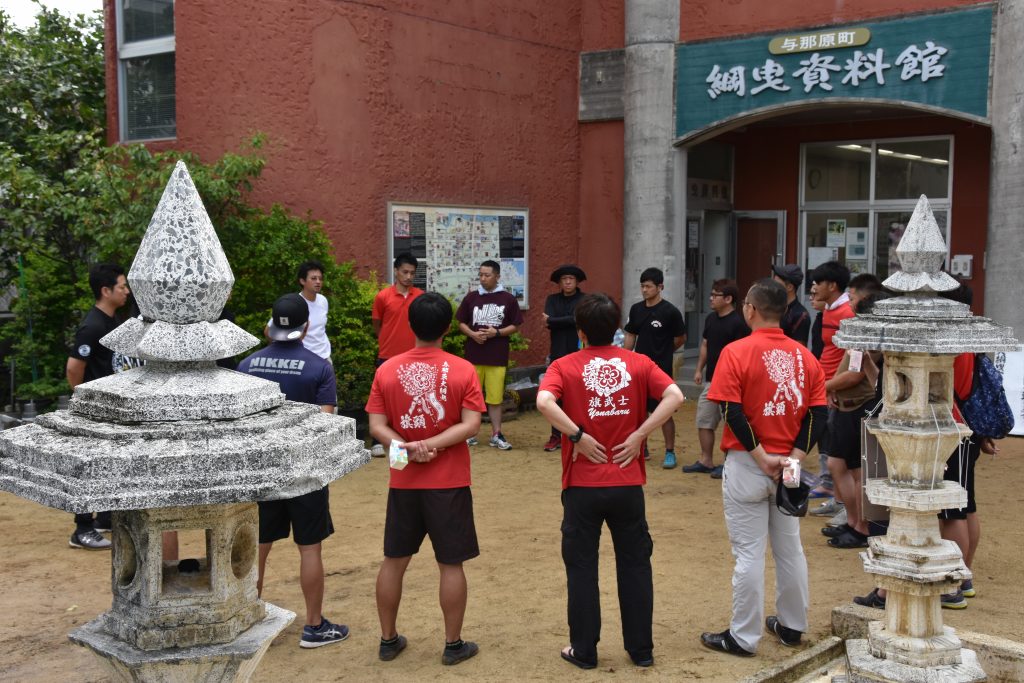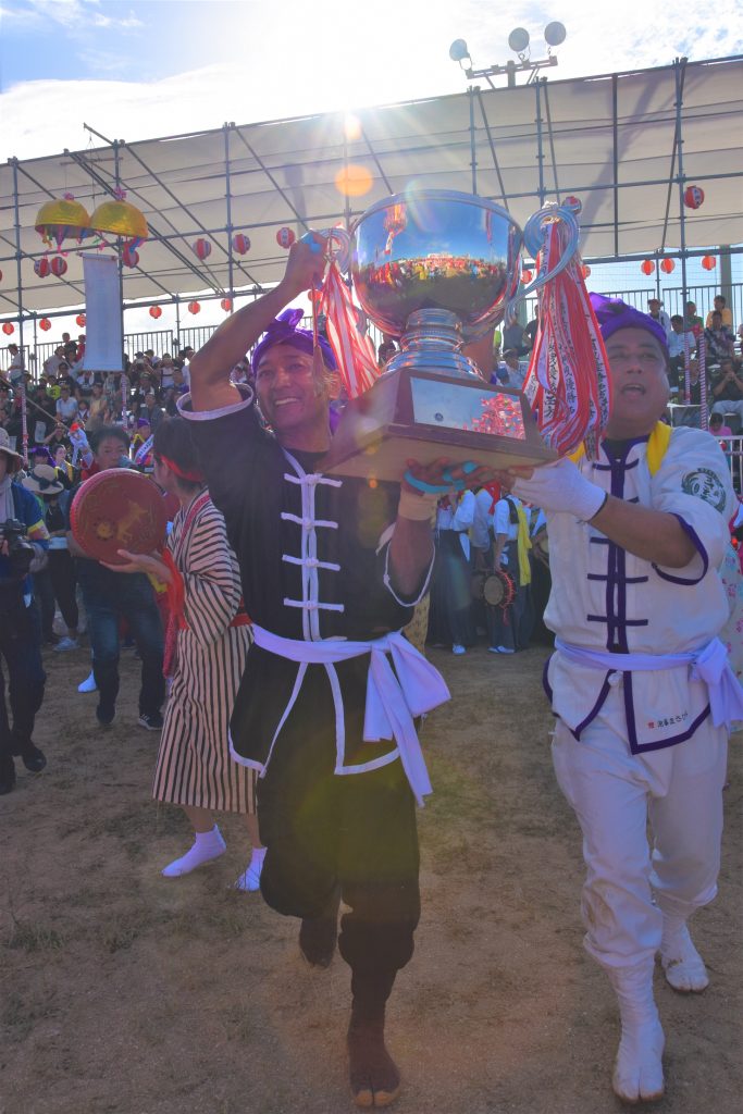 本来は2回戦あるのですが、今年は大綱が切れるハプニングがあったため、1回戦で終了。綱武士(ちなむし)たちは会場から、親川(綱曳資料館)に戻って慰労会をします。