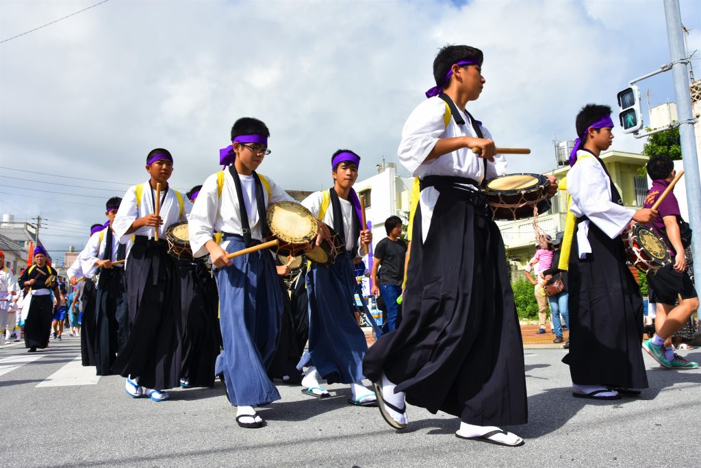 与那原中学校2年生男子の金鼓隊(きんこたい)がやってきました。この日のために1週間練習しました。