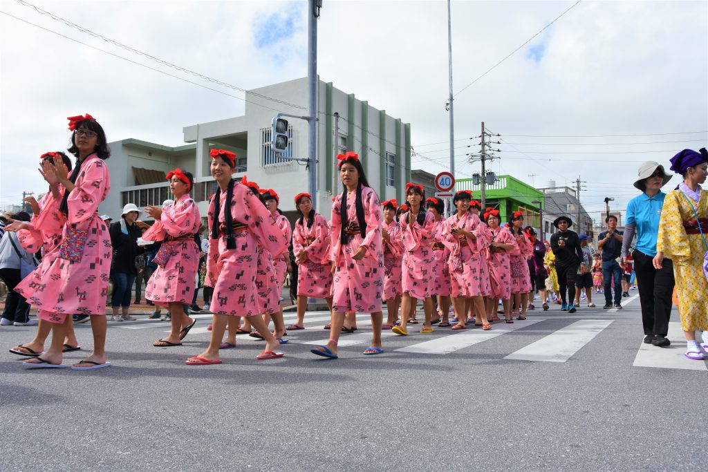与那原中学校2年生女子の前舞い(メーモーイ)。大綱をこっちにおいで~と呼び寄せる役目をします。大綱に向かって踊るので、行列の時には、後ろ向きに進行します。