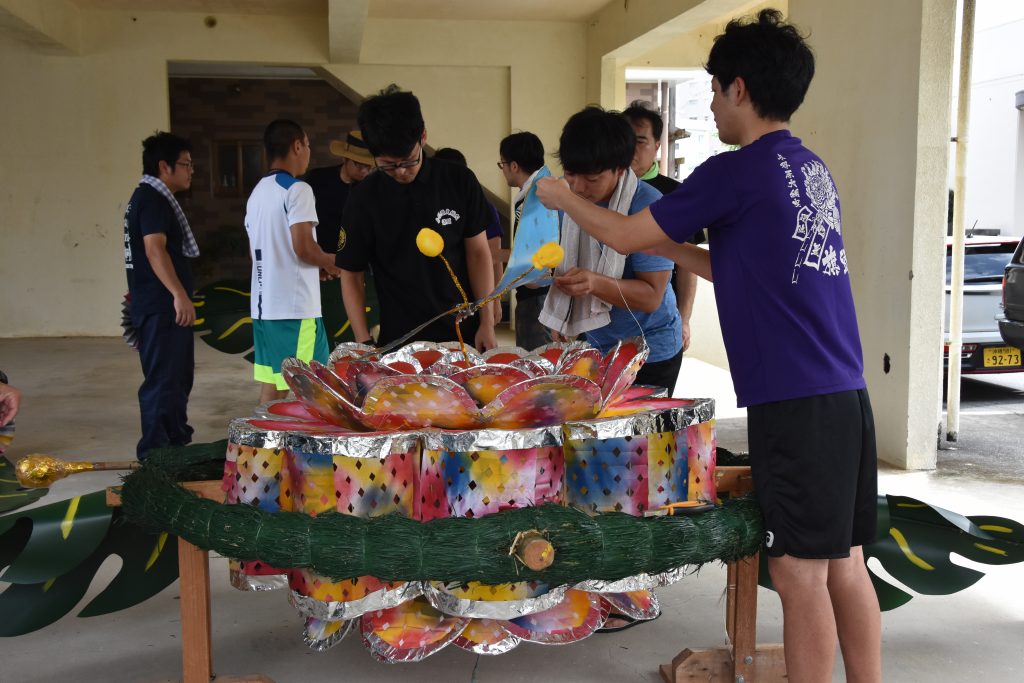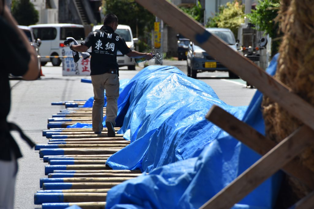 東(あがり)の旗頭は、中心から横に張り出している飾りをここでつけて最後の仕上げをします。