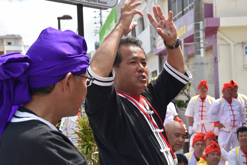 お父さんにサージをまいてもらう息子くん。与那原の大綱曳はDNAで脈々と引き継がれていっています。