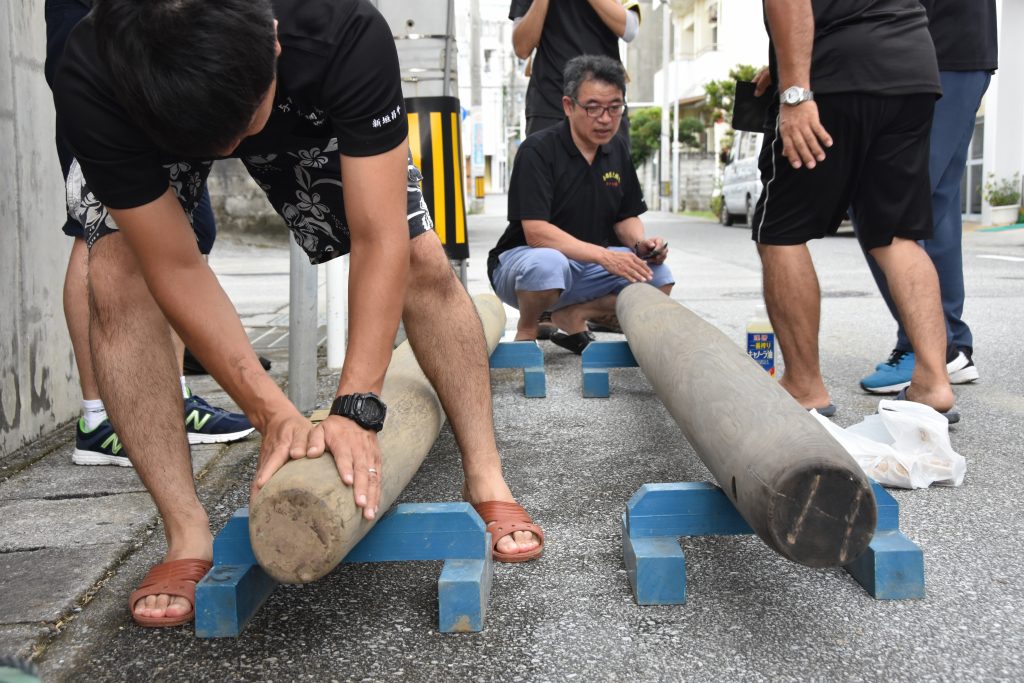 朝8時をまわったら・・・わらわらと綱武士(ちなむし)たちがやってきました。カナチ棒係は、再度、綺麗にやすりをかけて、その上に油を塗りピカピカに仕上げます。